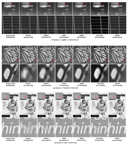 - Kim, J.; Lee, J.; Lee, K. Accurate image super-resolution using very deep convolutional networks. In Proceedings of the Conference on Computer Vision and Pattern Recognition, Las Vegas, NY, USA, 27–30 June 2016; pp. 1646–1654. [Google Scholar]