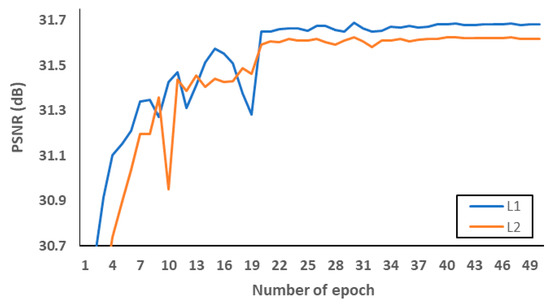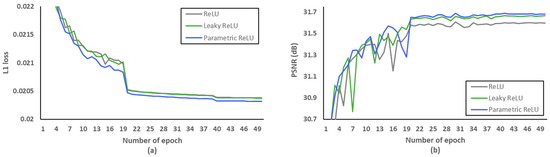 Firstly, we investigated what loss functions and activation functions were beneficial to the proposed network. According to [45], L2 loss does not always guarantee better SR performance in terms of PSNR and SSIM, although it is widely used to represent PSNR at the network training stage. Therefore, we conducted PSNR comparisons to choose the well matched loss function. Figure 8 and Table 6 indicate that L1 loss can be suitable to the proposed network structure. In addition, leaky rectified linear unit (Leaky ReLU) [46] and parametric ReLU can be replaced with ReLU to avoid the gradient vanishing effect in the negative side. In order to avoid overfitting at the training stage, we evaluated L1 loss according to various epochs as shown in Figure 9a. After setting the number of epochs to 50, we measured PSNR as a SR performance in the L1 loss functions. As demonstrated in Figure 9b, we confirmed that parametric ReLU is superior to other activation functions on the proposed MCDN.