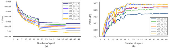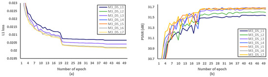 Verification of the number of dense layer (L) per a dense block in terms of SR performance. (a) L1 loss per epoch. (b) PSNR per epoch.