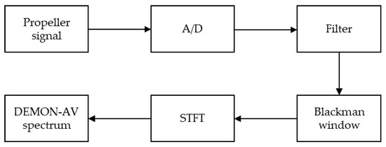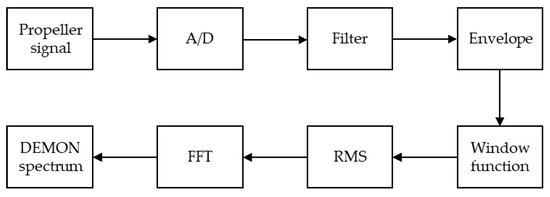 The Figure 1 shows the procedure to perform the DEMON algorithm. In this procedure, the propeller signal is first of all converted from analog to the digital signal. Afterwards, a bandpass filter is used to extract the designed cavitation noise signal. The envelope of the cavitation noise signal is then computed. A window function is used to capture a period of the envelop of the cavitation noise signal. After computing the root mean square (RMS) of the above-mentioned windowed signal, the Fast Fourier Transform (FFT) is applied to obtain the fundamental frequencies of cavitation noise, which are the typical features for detection and classification of the propellers.