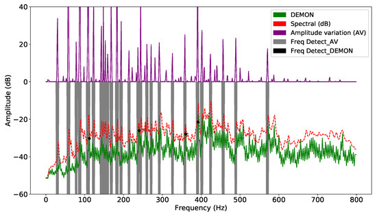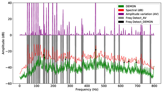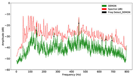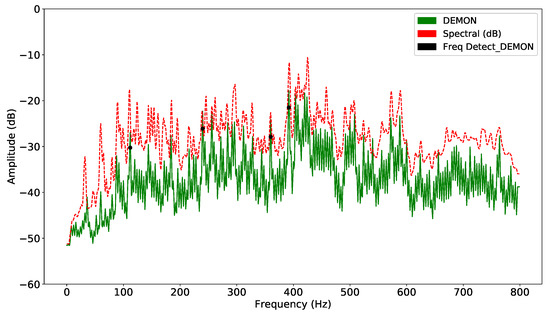 In both methods, computation requires the definition of a target frequency window; unsuitable selection of input parameters can make the detection task unfeasible. Each sample is smoothed by the window function, and the corresponding standard deviations are calculated. The signal is detected whenever the corresponding signal exceeds the corresponding detection threshold. The frequency amplitude of each segment is averaged to obtain a unique representative value. This technique divides the acoustic signal into consecutive overlapping segments. When the signal is unstable, the detection and classification accuracy will be reduced significantly. DL models can solve this problem more easily, because they extract hidden features using layers. On the other hand, as there are various types of noise, suitable selection of features plays an important role in guaranteeing the performance of the model. Thus, the result of improving DEMON by amplitude variation will reduce false alarms, while retaining sufficient features to increase detection accuracy. DEMON considers the adjacent frequencies to be an envelope, therefore, it can only detect one maximum peak frequency. On the other hand, DEMON-AV focuses on calculating the amplitude variation between adjacent frequencies, then by observing the frequency changes along the signal spectrum, it can show the characteristics of each amplitude peak frequency. Based on the recorded data (Record-1), the Figure 3 shows the signal frequencies detected by the original DEMON algorithm, whereas the Figure 4 illustrates the detected results by using the DEMON-AV. It is clear that the proposed DEMON-AV shows a better performance in terms of characteristic frequencies and harmonics separation for a given measured acoustic data, when it is compared to the original DEMON. Based on the Record-2, the similar results can be obtained by using the original DEMON and the DEMON-AV, which are plotted in the Figure 5 and the Figure 6, respectively.