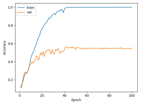 We used data sets that had been pre-processed by DEMON and DEMON-AV as inputs to LeNet, VGG, and our proposed CNN model. It is easy to see the difference in the accuracy between the models. We separated the samples into 70% for the training set, 20% for the validation set, and 10% for the test set. We also used a spectrogram size of (3 × 224 × 224) to include in the CNN model for training. From analyzing results between the models, the accuracy of LeNet and VGG with DEMON pre-processing is only 54%, as shown in Figure 11, and 63%, as depicted in Figure 12, respectively. The training time of LeNet is 3.5 h, while that of VGG is 4 h. Our proposed CNN pre-processed by DEMON reached the accuracy level of 80% as illustrated in Figure 13, which is higher than the two previous models, with the same training time.