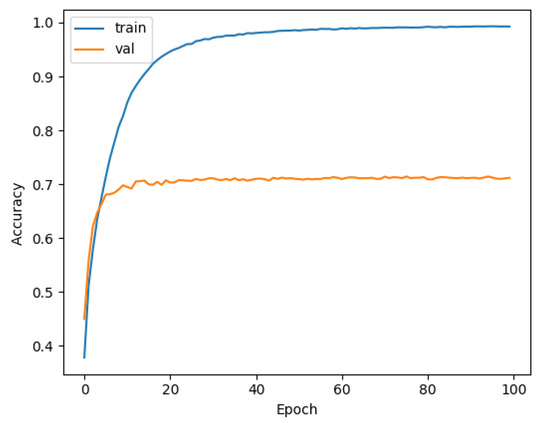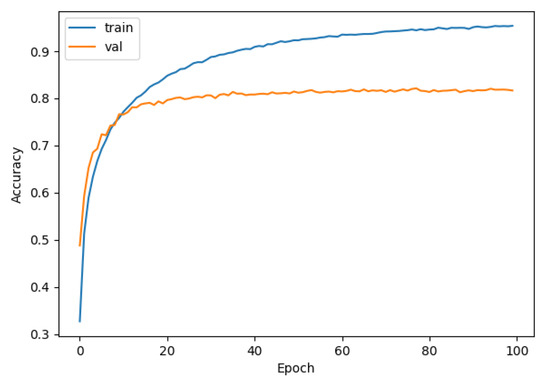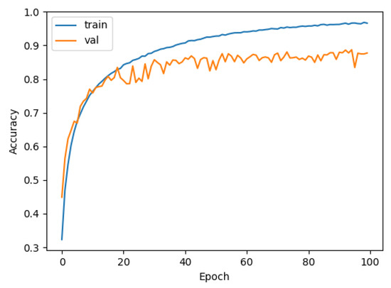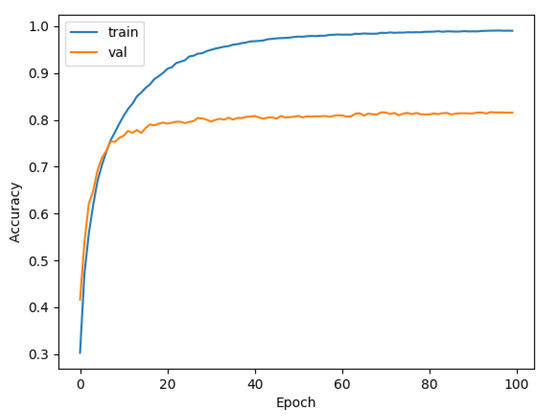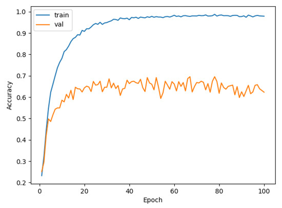 Similarly, we tested LeNet and VGG using DEMON-AV pre-processing for a training time of 4 h, and obtained the accuracy result of 70%, as shown in Figure 14, and of 78%, as given in Figure 15, respectively. Finally, we pre-processed our proposed CNN with DEMON-AV, and the obtained accuracy result is 90% as depicted in Figure 16, which is the highest accuracy obtained by all tested models.