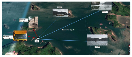 Our simulation used the dataset from the project: “An underwater vessel noise data-base” by the Research Center for Telecommunication Technologies—Universida de Vigo [25], as well as the dataset recorded by ourselves—the Institute of Electronics—in Lan Ha Bay, Hai Phong, Vietnam. Datasets include various types of underwater ship sounds. The underwater channel used for data collection was built on the geometry channel which were introduced and demonstrated by Van Duc Nguyen et al. [26,27]. The sounds were recorded in shallow waters in real conditions at different times during the day, which contains both natural and anthropogenic environment noise. The system uses hydrophones BII-7001-SN:0602, a product of Benthoway in Canada. BII’s is a ommi-spherical hydrophone which can receive a low frequency until 10 Hz, and offer excellent acoustic characteristics of low noise and durability. Bespoke built-in pre-amplifiers allow the hydrophones to be used with long extension cables with no loss in sensitivity [28]. The scenario for experiments is shown in Figure 20.