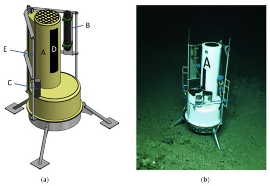 The landers are designed to adapt to the requirements of various surveys with the capacity to change instrument packages and offer a stable platform on the seabed from which data can be collected. The Little MonStas offer this capacity consisting of a Technicap PPS 4/3–24S sediment trap (Technicap, La Turbie, France) (A in Figure 1a) depth-rated to 6000 mwd (meter water depth) in a fiberglass housing (glass-reinforced polyester on an alimentary gel-coat) braced by a marine grade aluminum frame that provides mounting for an array of additional scientific instrumentation as well as ROV manipulator arm grab holds (E in Figure 1a) for ROV-based deployment and recovery.