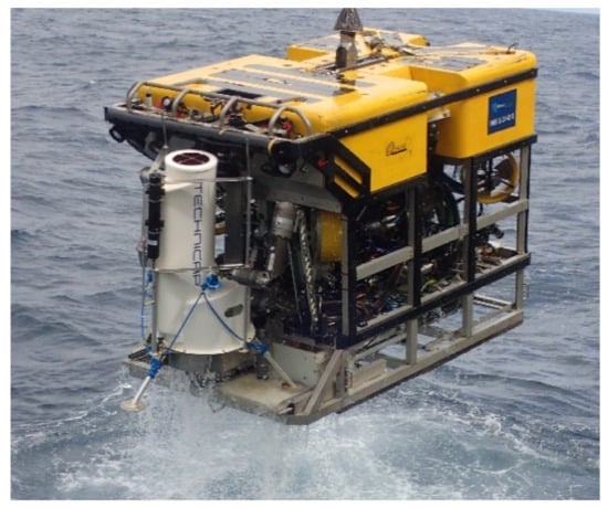 In May 2019, 14 ROV dives were completed to survey the PBC and the 8 Little MonStas were deployed: 7 of them at depths between 600 and 840 mwd in the upper PBC and one at 2125 mwd in the deeper canyon (Figure 3) [25]. Deployment operations involved a Little MonSta secured by the ROV (see Figure 2) and deployed vertically to a predesignated destination on the seabed where ROV inspection would fine-tune the precise location. To do this, the live video feed from the ROV could be inspected by experts (scientists and ROV pilots) to make an informed decision on safe and strategic deployment. The Little MonSta was then deployed onto the seabed and the position noted. The immediate surrounds of the site were systematically documented with ROV video after which the ROV was recovered to deck. Deployments averaged 3 h 18 min for the shallower sites and 5 h 25 min for the only deep canyon dive from the time the ROV left the deck to the time it returned. Descent rates ranged from 14 to 24 m min−1 with a mean of 18 m min−1, while ascent rates averaged 23 m min−1. The difference may indicate greater care by the ROV pilot while the lander was attached to the ROV and/or slightly increased drag. During the deployment campaign, two dives were repeated due to hydraulic faults with the ROV and a further two because of the Little MonSta toppled over during deployment, requiring the Little MonStas to be returned to the surface for inspection before redeployment.