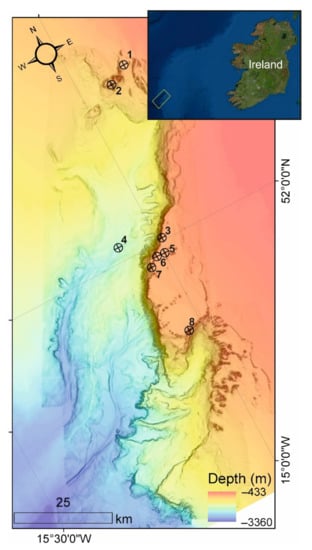 - Lim, A.; O’Reilly, L.; Summer, G.; Harris, K.; Shine, A.; Harman, L.; Appah, J.; Macedo de Oliveira, L.; Boyd, J.; Anders, B.; et al. CE19008 Cruise Report: Monitoring Changes in Submarine Canyon Coral Habitats-Leg 1 (MoCha_SCan). 2019. Available online: http://marinegeology.ucc.ie/wp-content/uploads/sites/87/2019/06/MoCha_SCan_Cruise_Report.pdf (accessed on 21 April 2021).