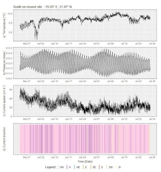 Figure 4 shows a time series plot of the measured parameters at various temporal scales. Daily variations in temperature and current speed (Figure 4a,c) correlate to semi-diurnal tidal cycles evident in the pressure record (Figure 4b). At a longer temporal scale, the water temperature dropped by 1.17 °C (from 9.77 to 8.60 °C) over a period of two days from 30 May to 1 June, indicating upwelling of cooler, deeper water from the canyon. Temperatures returned to their pre-cooling average by 3 June. Another two periods of cooling, albeit less pronounced with a drop of only ~0.5–1 °C, can be observed in the temperatures recorded on 13 June and 24 June. These periods of cooling correspond to elevated wind speeds measured at the ocean surface, blowing parallel to the continental slope (either southerly or northerly) and with gusts reaching moderate to fresh gales. Dickson and McCave (1986) [27] attributed near-bed cooling at ~460 mwd to strong northerly (i.e., along-slope) gales, invoking Ekman-transport as the upwelling mechanism on the Porcupine Bank. This earlier observation is corroborated by the findings from the Little MonSta lander array, whereby the canyon may serve as a conduit for Ekman transport-induced upwelling flowing onto the shelf. Finally, the lander array reveals a long-term temporal trend of increasing mean temperatures into the summer months and decreasing current speeds over the sampling period.