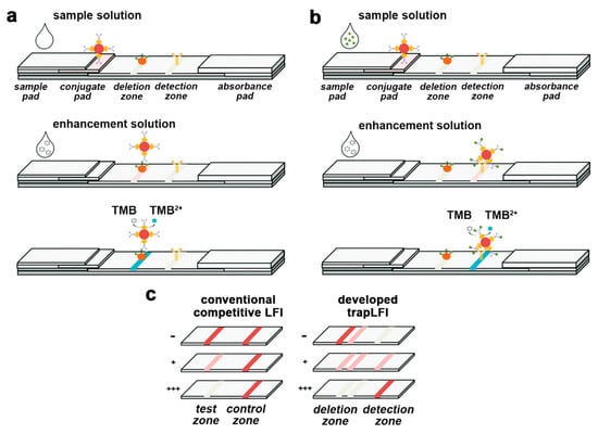 Schematic illustration of mechanism for the trapLFI biosensor with (a) low and (b) high concentration of cortisol, and (c) comparison of signal behavior of conventional competitive LFIA and trapLFI biosensor in the presence of different concentrations of cortisol (- negative sample, + positive sample low concentration, +++ positive sample high concentration). Adapted from Ref. [52], Copyright (2018), with permission from The Royal Society of Chemistry.