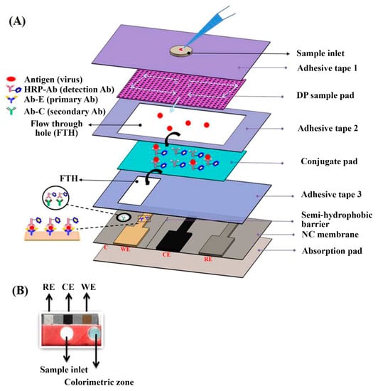 - Bhardwaj, J.; Sharma, A.; Jang, J. Vertical flow-based paper immunosensor for rapid electrochemical and colorimetric detec-tion of influenza virus using a different pore size sample pad. Biosens. Bioelectron. 2019, 126, 36–43. [Google Scholar] [CrossRef]