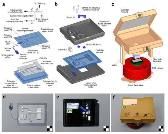 Portable CL-LFIA biosensor for the measurement of salivary cortisol levels used aboard the International Space Station (ISS): schematic drawings and images of (a,d) the LFIA fluidic element, (b,e) the LFIA cartridge and (c,f) the CL reader. A detailed view of the fluidics of the LFIA fluidic element around the sample metering chamber is shown on top of panel (a). Scale checkerboards are 2 × 2 cm. Reprinted from Ref. [69], Copyright (2018), with permission from Elsevier.
