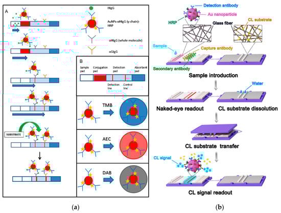 (a): (A) Scheme of the LFIA for the detection of HIgG. (B) Detail of the different parts of a LFIA strip and cartoons representing the AuNP modified with the antibody anti-human IgG γ chain specific HRP modified, and the different colors expected for the different substrates (TMB, AEC and DAB) used. Reprinted from Ref [72], Copyright (2012), with permission from Elsevier. (b) Scheme of the CLFAs for the Detection of Targets: Sample is introduced on the sample pad and moves to the absorbent pad. When sample flows through the conjugate pad, the targets are recognized by the detection antibodies on the AuNPs. With sample flowing through the NC membrane, targets and detection antibodies, as well as AuNPs, are immobilized on the NC membrane. After the appearance of the red lines because of the aggregation of AuNPs, the substrate pad containing lyophilized substrate is covered on the LFA strip for the transfer of the CL substrate. Then, the substrate pad is removed, and the CL signal is captured for quantitative detection of targets. Reprinted from Ref [76], Copyright (2018), with permission of the American Chemical Society.