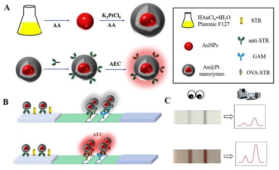 Au-Pt NPs were also recently exploited for the detection of streptomycin, a typical aminoglycoside antibiotic (Figure 5). A novel LFIA based on Au-Pt NPs as both visual tag and artificial enzyme for colorimetric detection was developed and compared with conventional LFIA based on AuNPs. The limits of detection were 1 ng mL−1 for the LFIA based on Au-Pt NPs as visual tag and 0.1 ng mL−1 for the enhanced LFIA based on the Au-Pt NPs enzyme-like activity, while a value of 8 ng mL−1 was obtained for the LFIA based on conventional AuNPs [97].