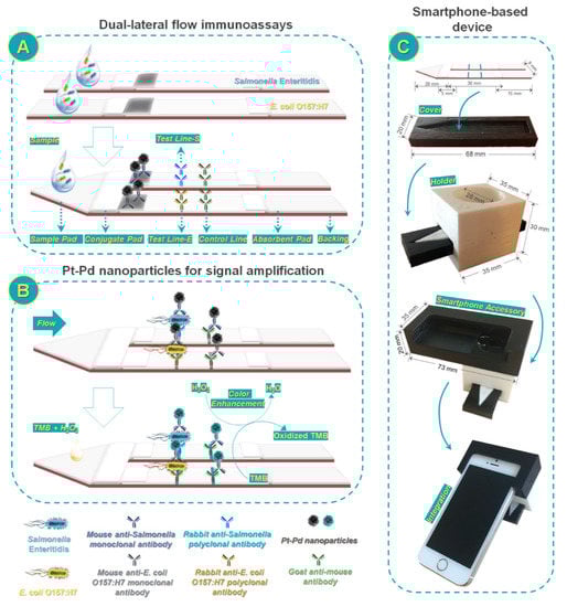 Scheme of smartphone-based dual lateral flow immunoassays for simultaneous detection of S. enteritidis and E. coli O157:H7 using Pd@Pt nanoparticles as signal amplification: (A) Dual lateral flow immunoassays; (B) Pd@Pt nanoparticles for signal amplification; and (C) smartphone-based device. Reprinted from Ref. [101], Copyright (2017), with permission from the American Chemical Society.