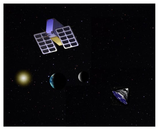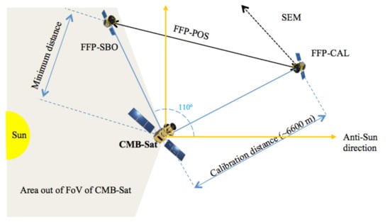 The scientific scope of the CubeSat concept is limited by its constraints of space, weight and power, and the consequent impact in the scientific instrumentation that can be accommodated. However, it is expected to be a very competitive solution for scientific applications that can be adapted to those constraints, as the calibration of ultra-sensitive CMB-Sats operating at L2, like LiteBIRD [,], PICO [] or CORE [] (see also the microwave spectro-polarimetry white paper for the “Voyage 2050” long-term planning of the ESA science programme []). Although the calibration satellite concept can be adapted to the characteristics of any of those missions, the CubeSat designed in this work takes into account the main characteristics of a LiteBIRD-like small aperture CMB space mission. The proposed calibration satellite has been conceived to travel as a piggyback integrated on the service platform of the main ship. It would be deployed once in the L2 orbit, to start the communication with the CMB-Sat for the formation flying and calibration activities. Furthermore, the small weight and cost of the CubeSats would allow them to be added to the main mission without having a great impact, and also to be conceived as science enhancements of the CMB polarization mission without jeopardizing it.