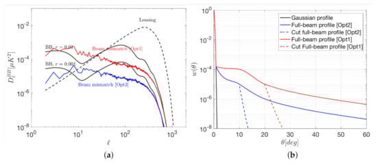 In order to accurately characterise the intensity beam, the Planck [,] CMB space mission showed that with several years of observations of a typical celestial source as Jupiter, a NF level of about −50 dB respect to the peak amplitude of the planet emission can be achieved, taking into account the overall contribution of the cosmological bands detectors. Although this level of accuracy can be slightly improved combining the data from other planets as Mars, Saturn, Uranus and Neptune, in the case of future ultra-sensitive space missions, it may result insufficient to characterise far side-lobes (FSL) placed at or more from the beam center, specially in polarization. To illustrate this, Figure 6 shows the BB signals (a) produced by the FSL of two non-ideal beam models (b) with FWHM = 30 arcmin and for a frequency of 140 GHz. The beam coloured in red has been modeled following the trend of the ones shown in [], while the beam coloured in blue has been modeled from the red one but presenting 10 dB lower side lobes from onwards. In this case, the spurious signal is produced by FSL placed at more than from the beam center, which would remain non-characterised using Jupiter. It has been calculated subtracting the signal of an auxiliary beam that is equal to the red one until , but from this angle it is equivalent to a Gaussian one (see the dashed red line in Figure 6b). In the case of the beam coloured in blue the spurious signal is produced by FSL placed at more than from the beam center and it is calculated, equivalently to the red one, using an auxiliary beam that behaves as a Gaussian one from onwards. For such a beam, Jupiter could provide information only until this angle, remaining the rest of it non-characterised. However, due to its more selective profile the produced spurious signal is about one order of magnitude lower than in the previous (red) case. For both beams it has been considered a reference NF level of −50 dB (available using Jupiter), which would allow to characterise them until (blue) and (red) from the beam center. However, at larger angles powerful signals coming from the galaxy could contaminate the CMB observations. It can be observed that, targeting , the spurious BB signal produced by the beam in red would mask the primordial signal for almost all multipole values while the beam in blue would be also an issue for multipole values around 10.