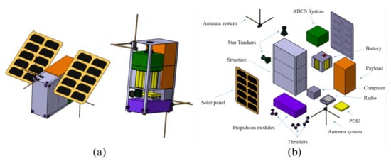 Exterior view (a) and exploded view (b) of the preliminary design for L2-CalSat. ADCS is the Attitude Determination and Control System, referred as AOCS in the text. PDU is the Power Distribution Unit.