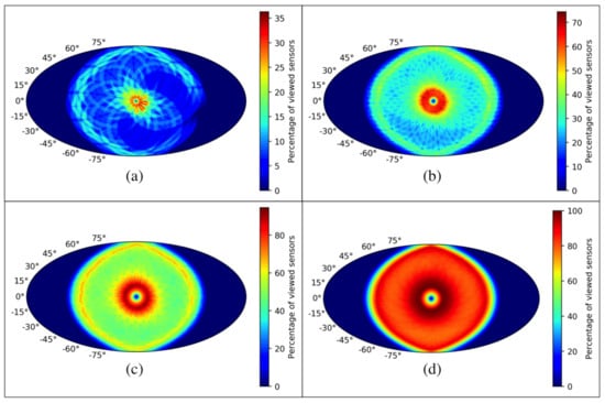 The percentage of viewed sensors (or detectors) is around 70% for 6 h (red region of Figure 11b) but it approaches 100% in that region for 12 h even when L2-CalSat is kept at the same position. It can also be observed that during a calibration session of 24 h, all the detectors could be covered from many more different positions; however, a calibration session of only 12 h has been assumed as baseline, since this calibration time would allow, among others, the polar angle calibration of almost the complete set of detectors.