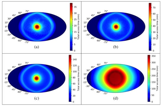 Total access time according to the position of L2-CalSat relative to the CMB satellite for a FoV of and throughout 6 (a), 12 (b) and 24 h (c), and for a FoV of and throughout 12 h (d).