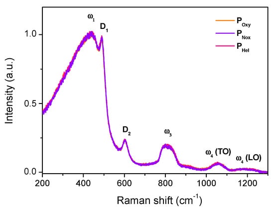 The microstructure of these three preforms was investigated through Raman spectroscopy. Figure 1 presents the normalized Raman spectra recorded in the core region of Ce-doped MCVD preforms. These spectra show the well-known vitreous SiO2 bands []. It can be seen that, independently of the atmosphere used during the preform fabrication, the Raman spectra are globally analogous, indicating that there is no significant difference between the glass structure of these three samples. Hence, the elaboration atmosphere does not notably impact the host silica matrix structure.