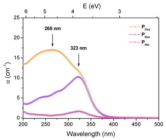 The concentration of the two valence species has been estimated from the absorption coefficient measured in Figure 2 and from the absorption cross-sections values reported for Ce3+ and Ce4+ ions in silica glass []. For the POxy preform, from the experimental absorption coefficient at 265 nm we estimated the Ce4+ concentration ions to be of about 1.7×1018 ions/cm3. Then, from the mean total Ce concentration, determined by EPMA, we calculated the Ce3+ concentration of 3.1 × 1018 ions/cm3 for POxy preform. In the case of PNox and PHel samples, considering the absorption coefficients of Ce3+ ions at 323 nm and the corresponding absorption cross-section value from [], the Ce3+ ions concentration was estimated to be about 10.2×1018 and 1.6×1018 ions/cm3 for PNox, and PHel, respectively. These values are close to the total concentration of Ce determined using EPMA. Hence, we consider that the concentration of Ce4+ ions is negligible in these samples and that cerium is incorporated under its trivalent (Ce3+) form.