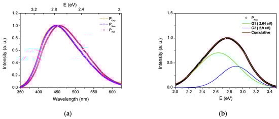 The photoluminescence spectra of the three Ce-doped preforms under excitation at 320 nm are presented in Figure 3a. As expected, all samples show a large visible emission band. However, while both POxy and PNox present the same PL spectrum shape with an emission band peaking around 450 nm, the PHel PL spectrum exhibits a red shift with a maximum around 460 nm. All samples reveal an asymmetrical PL band, which is attributed to the allowed electric dipole 5d–4f transition of Ce3+. The decomposition into two Gaussian functions (G1 and G2) can be made, as shown in the example of PNox (Figure 3b). Table 1 summarizes the characteristics of the G1 and G2 bands for the three samples. Independently of the fabrication conditions, G1 and G2 bands are located at 2.64 and 2.9 eV, respectively. These two values originate from the spin-orbit splitting of the ground state into sublevels 2F5/2 and 2F7/2. The energy difference between the two sublevels was found around 0.26 eV (2097 cm−1), in agreement with the typical values reported in the case of Ce3+ ions in oxide glasses [,].