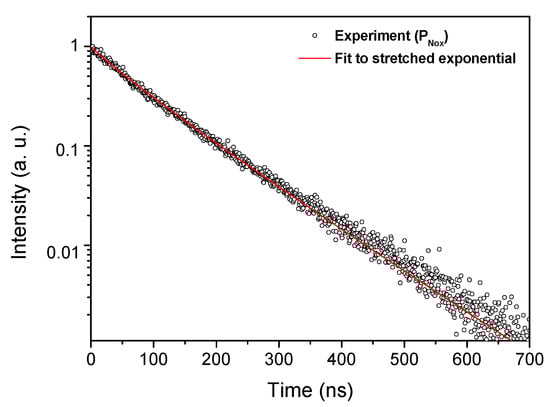 PL decay curve recorded on PNox at 450 nm wavelength, under excitation at 320 nm and its corresponding curve fitting analysis using Equation (1).