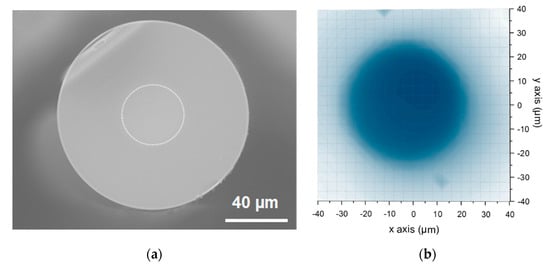 For dosimetry applications, an optical fiber was fabricated using the PNox preform with the best QY. This fiber is composed of a central non-guiding Ce-doped core surrounded by a pure silica cladding. This fiber has an outer diameter of about 125 µm while the Ce-doped core section has a diameter of about 40 µm. These considerations were verified via a microscopic characterization (SEM) of the fiber transverse section (Figure 5a) as well as by the monitoring of the PL-signal distribution of the emitting centers (Ce ions) under an excitation at 325 nm and a spatial step of 2.5 µm (Figure 5b). Indeed, the core-to-cladding refractive index difference is very small and therefore, for guiding purpose, a low refractive index polymer was applied as a coating, leading to a numerical aperture (NA) of about 0.4 for the 125 µm diameter inner cladding. The weak overlap between the guided modes and the Ce-doped zone helps to reduce the re-absorption of the light emitted by the core material.