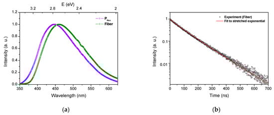 (a) Normalized PL spectra of Ce-doped optical fiber and its corresponding PNox preform under 320 nm laser excitation. (b) PL decay curve at 450 nm, after probe excitation at 320 nm and a fit using Equation (1).