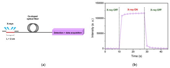 (a) Basic representation of the experimental setup used to evaluate the RL response of the Ce-doped optical fiber partially exposed to X-ray beam. (b) RL signal evolution versus time under 19.6 Gy(SiO2)/s dose rate.