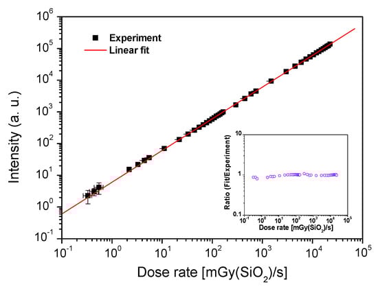 In Figure 8, the averaged values of the intensity calculated in the region of the plateau are reported as a function of the X-ray dose rate. The linearity of the RL signal intensity versus the dose rate is depicted in the range from 330 µGy(SiO2)/s to at least 22.6 Gy(SiO2)/s. This maximum limit is the highest dose rate attainable with the experimental setup in LABHX facility (with respect to our experimental conditions: dose rate homogeneity over the entire sample spatial zone). We cannot exclude that the signal linearity is extended over this limit. The goodness of fit was checked by R2 value (0.99955). The plot of the ratio between fitted and experimental values was reported as a function of the dose rate in the inset of Figure 8. The small variations of experimental to fitted results reflect the linearity confidence. The measurement uncertainty was ≈10%, essentially due to the accuracy of the ionization chamber used to calibrate the dose rate. Otherwise the reproducibility of measurements was checked for several dose rate values. To the best of our knowledge, such a linear response is reported for the first time over five decades, with a Ce3+-doped silica optical fiber in an all-fibred dosimetry configuration.