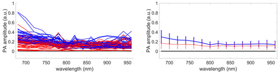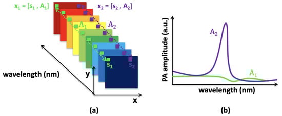 with as the sample index; see Figure 1a. Before any other processing, the data need to be normalized over the range . This allows the same range of values for data from different acquisition systems. Two types of pixels are illustrated in Figure 1: pixel x contains only noise, called the background, with low and flat photoacoustic amplitudes at all wavelengths (Figure 1b, green curve A), and pixel x provides information on the optical absorbers, with a high photoacoustic signal (Figure 1b, purple curve A).