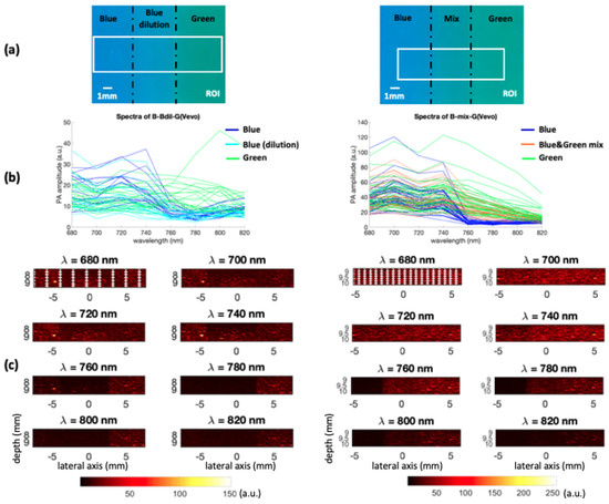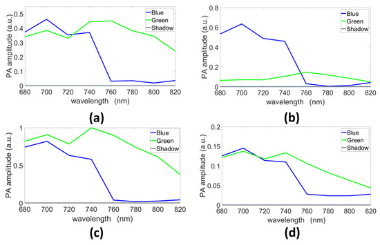 The data were acquired using the full range of available wavelengths nm nm) with 1 nm steps, which required less than 1 min of acquisition time. The time to switch from one wavelength to the other and to acquire the corresponding image is around 0.2 s. Usually, in multispectral photoacoustic imaging, from 5 to 10 wavelengths are used because the information collected is then sufficient to discriminate or quantify biological chromophores with an acceptable processing time. To get closer to this framework, only eight of the acquired wavelengths were selected to construct our dataset, from 680 nm to 820 nm, with 20 nm steps. These wavelengths were chosen because the used optical absorbers (blue and green inks) can be discriminated in this range (see Figure 3).