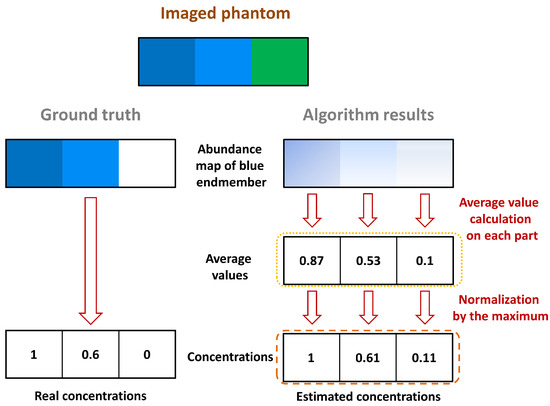 For each abundance map of each endmember, a mean concentration was calculated for each part of the imaged region, as illustrated in Figure 5. The illustrative phantom considered in Figure 5 is composed of a pure blue chromophore, a dilution of this chromophore, and a pure green chromophore (from left to right). Considering the abundances related to the blue endmember, three average values were calculated: one for each part, as circled by the yellow dotted line in Figure 5. As we assume that the pure blue chromophore, which corresponds to the endmember of interest, is present in the image, the mean values were normalized by their maximum, as circled by the orange dashed line in Figure 5. Where the data would be perfectly unmixed, the maximum value should correspond to the pure blue part of the phantom (i.e., the left part), which is then set to 1 after normalization. The other normalized values should correspond to the relative concentrations of the pure chromophore, i.e., the relative concentration of blue in the illustrative example in Figure 5.