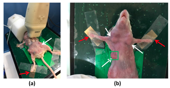 Mouse with breast tumors in the Vevo LAZR system. White and red arrows indicated the tumors and heartbeat detectors, respectively. In (a) the anesthesia mask can be seen (white block). The green square in (b) highlights the imaged region-of-interest.