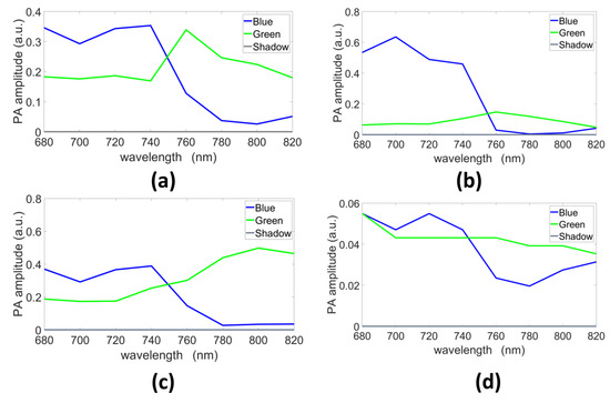 The endmembers estimated with GLUP, VCA, N-FINDR, and SSM-S are presented in Figure 7a–d, respectively. They allow us to discriminate the pure blue and green chromophores even if they do not exactly fit the reference spectra measured with a spectrometer (Figure 3). Indeed, as already mentioned, light absorption and diffusion in tissue impact the pure chromophore spectrum. The shape tendency is, however, kept. The shadow endmember is also plotted in each panel.