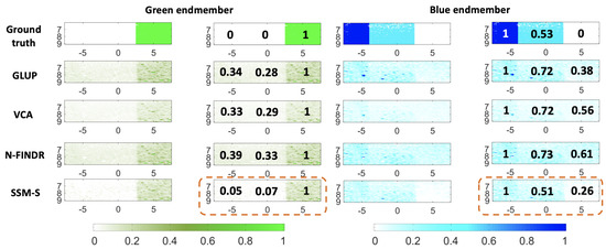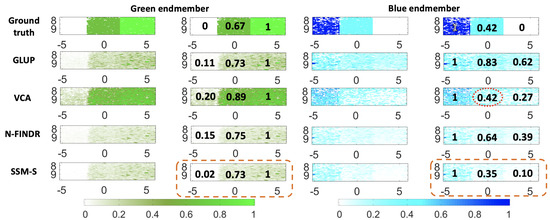 The abundance maps and the estimated mean concentrations are presented in Figure 10, for both of the endmembers. The blue abundance maps calculated with the endmembers extracted by GLUP and VCA localize the pure blue chromophore part (left) well, while the pure green part is more difficult to delimit. Indeed, the abundance values are similar in the central and right parts. For the N-FINDR and SSM-S blue abundance maps, the three parts are more visible. On the SSM-S abundance maps, the green part is characterized by a low concentration of 0.10, which is close to the ground truth value. For the green abundance maps, all of the methods allow discrimination of the blue part (left) and the mixed part (center). The VCA abundance map does not allow for clear discrimination of the mixed (central) and green (right) parts, while this is possible with the other methods.