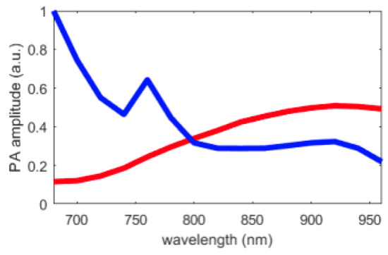 A commercial multispectral photoacoustic system (Vevo LAZR; Visualsonics, Fujifilm) was used for this study; see Figure 2. The optical source of this system is a Nd:YAG pulsed laser with a pulse duration of 5 ns and a 20 Hz repetition rate, which is coupled to an optical parametric oscillator to select the transmission wavelengths [27]. The wavelength can be set from 680 nm to 970 nm. The photoacoustic probe that was used (LZ400) is composed of 256 elements, which can acquire ultrasound signals in the frequency range from 18 MHz to 38 MHz. The imaging depth is approximately cm and the imaged region of interest is around 1 cm. The images are reconstructed with a delay-and-sum algorithm. For every acquisition, the corresponding fluence is saved. For the acquisitions presented in this study, the fluence is varying of only 2% between the minimal and maximal fluences. As the variation is low and the proposed methods are based on unsupervised endmembers extraction with relative comparison between spectra, the images were not normalized by the fluence.
