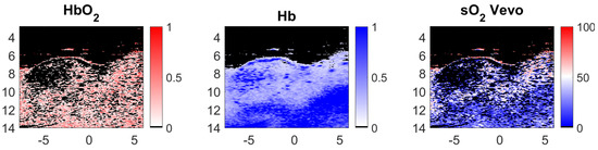 Oxygenated hemoglobin (HbO) and deoxygenated hemoglobin (Hb) concentration maps and sO map (in %) calculated with the Vevo LAZR concentration maps and Equation (16), from left to right, respectively. The image axes are in millimeters.