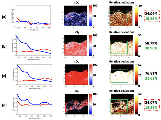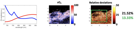 Finally, considering its robustness, SSM-S is an interesting solution, as it converges to a unique solution while achieving a small relative deviation. However, it is important to note that the endmembers extracted with SSM-S do not look like the theoretical ones; see Figure 16a. As mentioned earlier, this could be due to the characteristics of the acquisition system and the light absorption and diffusion in tissue. In addition, in tumor tissues, pure Hb and HbO are not the most frequently present chromophores. The Vevo LAZR sO values (Figure 12) confirm this observation as they are mainly comprised between 25% and 75%, and then correspond to a mix of pure chromophores. This means that the endmembers that were actually extracted probably represent mixed chromophores instead of the pure Hb and HbO. Regardless, the results obtained with the SSM-S/FCLS strategy are very encouraging in allowing accurate measurements of sO with photoacoustic imaging.