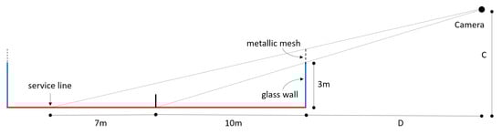The solution , indicates that the camera should be placed ≈7.6 m above the court, and ≈15.5 m from the wall (see Figure 1).