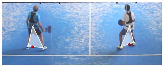Since no ground truth positions are available for elite padel videos, we created a simple application for their manual annotation. In a pilot study, we observed that directly estimating the 2D position (as the vertical projection of the hip) was a difficult task. Therefore, we decided to ask the annotators to identify three joints for each player: the left ankle , the right ankle , and the hip center (Figure 4). From the image-space positions of these joints, we estimated the image-space position of the player as with and (Figure 4). That is, we use the hip to estimate the image-space horizontal coordinate and the average of the feet to estimate the vertical coordinate (near the bottom part of the image-space projection of the player). The court-space position was computed by multiplying the perspective transform matrix.