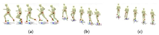 For players standing or walking, the method above provides an accurate estimate of the true court-space 2D position. For running players though we expect a larger error, since at some frames both feet are in the air. We analyzed some running cycles by rendering a realistic human avatar [33] using Motion Capture Data from Carnegie Mellon University Motion Capture Database http://mocap.cs.cmu.edu/, accessed on 1 March 2021. Figure 5 shows such deviations (in image-space) for different player poses and orientations. Fortunately, the vertical displacement is small and roughly constant along running animation cycles.
