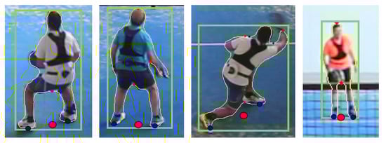 Finally, we also report the accuracy of segmentation methods. We used Detectron2 [24], available at https://github.com/facebookresearch/detectron2, accessed on 1 February 2021. We extracted the contour of detected person instances and estimated player positions by combining feet and hip estimates. We used contour points at local minima (bottom part of the instances) to estimate image-space feet locations (Figure 7) and the minimum of all detected local maxima to estimate the hip.