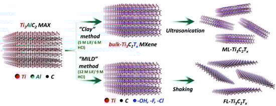 - Naguib, M.; Kurtoglu, M.; Presser, V.; Lu, J.; Niu, J.; Heon, M.; Hultman, L.; Gogotsi, Y.; Barsoum, M.W. Two-Dimensional Nanocrystals Produced by Exfoliation of Ti3AlC2. Adv. Mater. 2011, 23, 4248–4253. [Google Scholar] [CrossRef]