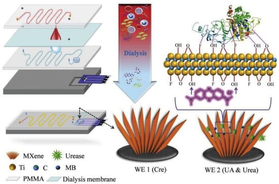 - Liu, J.; Jiang, X.; Zhang, R.; Zhang, Y.; Wu, L.; Lu, W.; Li, J.; Li, Y.; Zhang, H. MXene-Enabled Electrochemical Microfluidic Biosensor: Applications toward Multicomponent Continuous Monitoring in Whole Blood. Adv. Funct. Mater. 2019, 29, 1807326. [Google Scholar] [CrossRef]