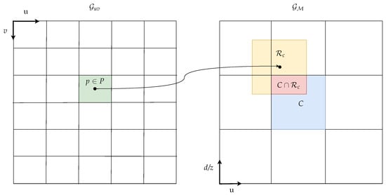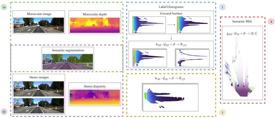 As introduced in [], we calculate the BBA based on the label histogram, which resembles the contribution of accumulated pixels to a class in a given grid cell. We use a u-disparity grid and a u-depth grid to compute the label histogram for stereo vision-based and monocular vision-based grid mapping, respectively. These discretization spaces have the advantage that disparity and depth estimation uncertainty can be modeled explicitly, as, e.g., outlined in []. For the sake of simplicity, we subsequently refer to the measurement grid as . The label histogram