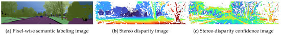 We execute our proposed method based on two setups using the Kitti odometry benchmark []. In the first case, we calculate stereo disparities based on the two color cameras in the Kitti sensor setup using the guided aggregation net for stereo matching presented by Zhang et al. in []. The authors connect a local guided aggregation layer that follows a traditional cost filtering refining thin structures to a semi-global aggregation layer. In the second setup, we only use the left color camera and compute a depth map using the unsupervised method presented by Godard et al. in []. Both neural networks are openly available on GitHub and have been trained or at least refined using the Kitti 2015 stereo vision benchmark. For calculating the pixelwise semantic labeling, the neural network proposed by Zhu et al. in [] was used. Their network architecture is openly available as well and achieves a mean intersection over union (IoU) of 72.8% in the Kitti semantic segmentation benchmark. Note that all of the above choices were made independently of runtime considerations. In both cases, the pixelwise confidences for depth and disparity, respectively, are set to one as the corresponding networks do not output adequate information. In Figure 6, an example of the three used input images is depicted.