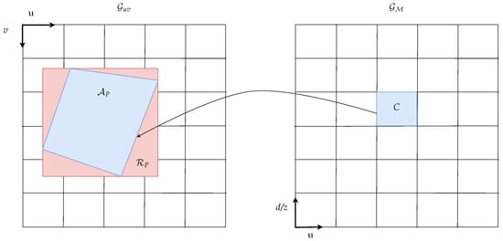 In the cartesian grid on the right-hand side, the grid cells are influenced by the distorted overlayed areas based on the corresponding u-disparity or u-depth grid cell, respectively.