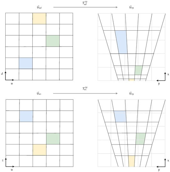 The label histogram grid map layers are transformed from u-disparity/-depth space to the cartesian space before the BBA calculation to prevent inconsistencies in the belief assignment due to interpolation artifacts. Note that cartesian grid cells close to the camera, for instance, correspond to many u-disparity grid cells, while one u-disparity grid cell covers several cartesian grid cells at far distances. The relations between the considered tessellations are sketched in Figure 5. Non-regular cell area correspondences occur not only between u-disparity/-depth and cartesian grids. Yguel et al. investigated this effect in detail for the switch from a polar to cartesian coordinate system in []. Simple remapping methods lead to the so-called Moiré effect due to undersampling, which is well known in computer graphics. We tackle this issue by applying a well-established upsampling principle in relevant areas. By analyzing the area ratio between a cartesian cell and the corresponding u-disparity/-depth cell, a set of points is chosen lying on an equidistant grid within the cell. The u-disparity/-depth coordinate is calculated for each point, and the label histogram value is computed based on the u-disparity/-depth grid map utilizing bilinear interpolation. The label histogram’s final value for the cartesian cell is a weighted average over all sampled cell points.